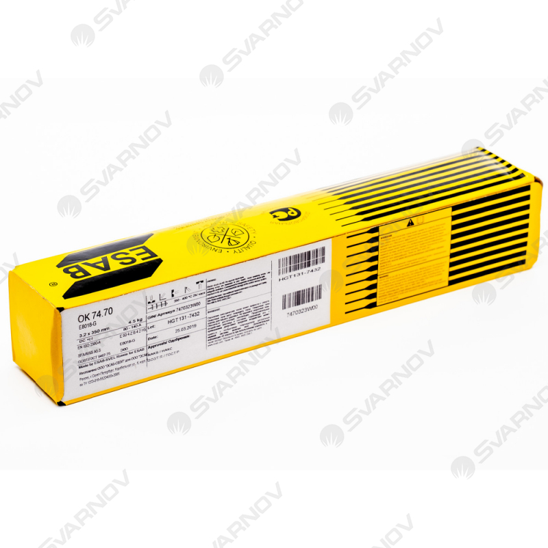 Электроды ОК 74.70 Esab – это электроды с основным покрытием, предназначены преимущественно для сварки заполняющих и облицовочного слоёв неповоротных стыков трубопроводов в положении вертикаль на подъем класса прочности API 5L Х60-Х70, а также других ответственных конструкций нормативным пределом текучести до 500 МПа включительно. Ток: = (+ / – ). Пространственные положения при сварке: 1, 2, 3, 4, 6. Режимы прокалки: 350-400°С, 2 часа.
