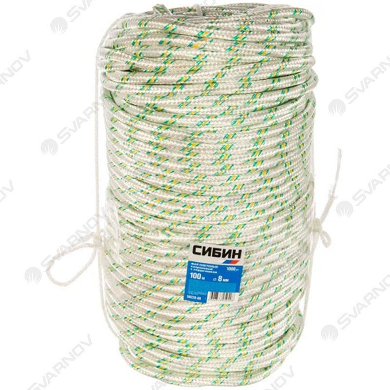 Фал 8мм (бухта 100м) с сердечником СИБИН - прочное, надежное и долговечное изделие из качественного искусственного материала. Не тонет в воде, не усаживается от влаги, не теряет свою прочность при намокании, не гниет и не разрушается под действием ультрафиолета и химикатов (кислот, щелочей, растворителей и пр).