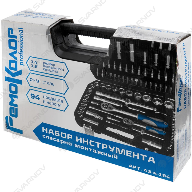 Набор головок торцовых и вставок 94 предмета РемоКолор предназначен для обслуживания автомобиля профессионалами и автолюбителями. Изделия в наборе изготовлены из высококачественной хромованадиевой стали, упругой и износостойкой. Кейс для инструментов выполнен из экологичного пластика.