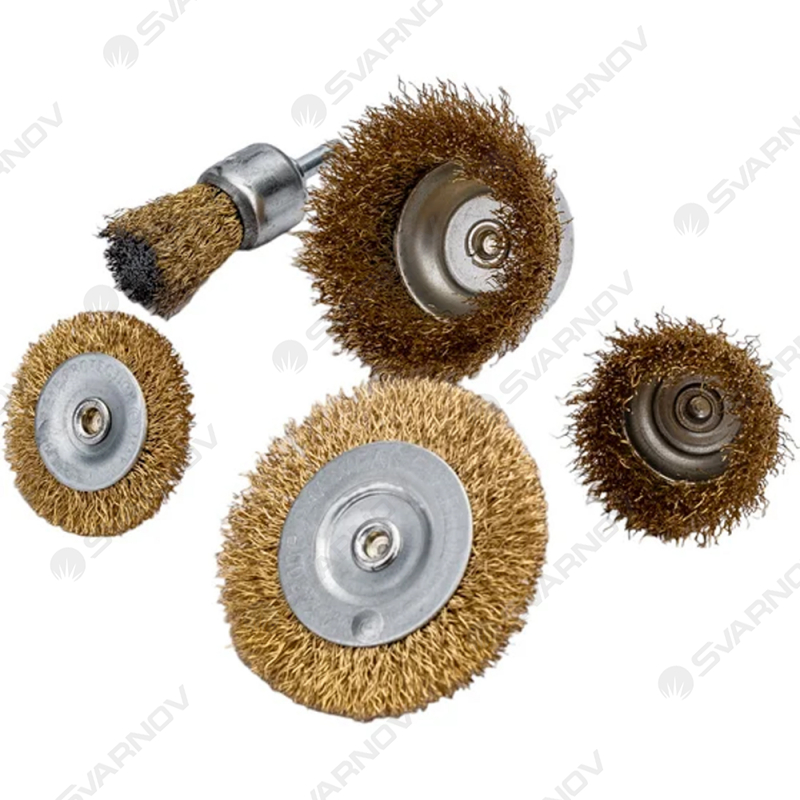 Набор щеток металл со шпильками 5пр (50мм, 75мм - плоские, 25мм, 50мм, 75мм - чашки) Ермак — универсальный комплект насадок для дрели, предназначенный для очистки и подготовки различных поверхностей. В набор входят плоские и чашечные щётки разных диаметров, что позволяет выбрать оптимальный вариант для конкретной задачи.