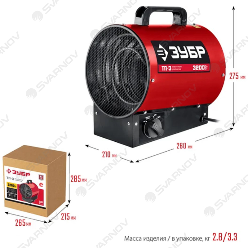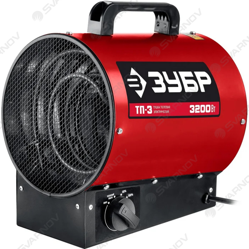 Пушка тепловая электрическая ЗУБР 3 кВт ТП-3 является эффективным источником основного или дополнительного обогрева различных неотапливаемых помещений. Прибор выполняет обогрев за счет горячего потока воздуха. Данная модель оборудована двумя режимами обогрева с помощью до 3 кВт и режимом обдува без нагрева.