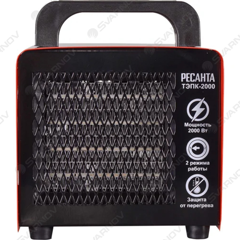 Пушка тепловая ТЭПК-2000 Ресанта работает от электросети, не выделяет выхлопных газов и отличается экологичностью. Керамический нагревательный элемент полностью безопасен для здоровья и работает с минимальным уровнем шума. Таким образом, данная модель подходит для помещений, где находятся люди, и оптимальна для использования на площади до 20 кв.м. Мощный вентилятор с нагревательным элементом 2 кВт обеспечивают быстрый приток теплого воздуха и его равномерное распределение. При этом возможна работа как на полной мощности, так и в энергосберегающем режиме – 1 кВт, что позволяет избежать лишнего расхода электричества. Керамика долго продолжает отдавать тепло даже после отключения прибора.