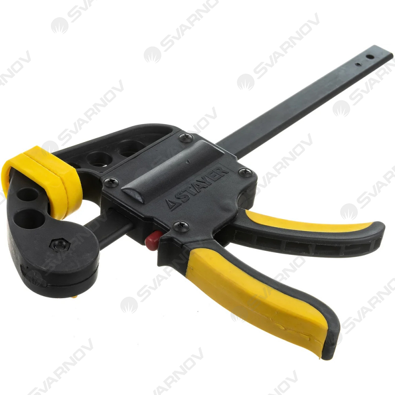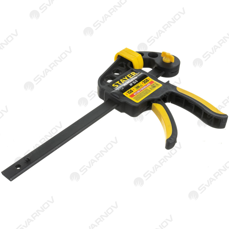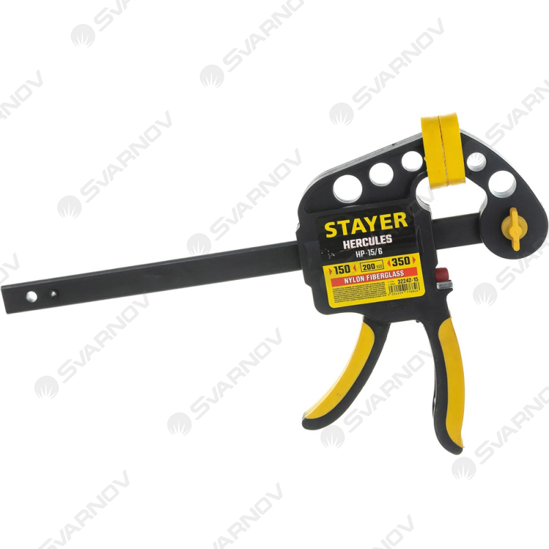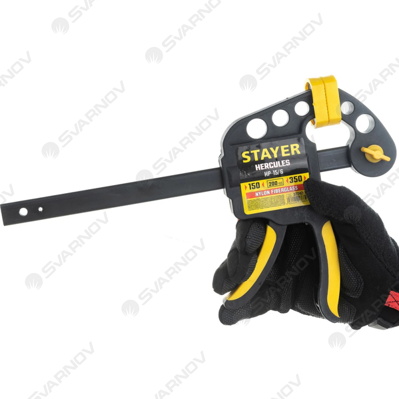 Струбцина пистолетная HP-15/6 HERCULES-P STAYER используется при выполнении слесарных и столярных работ для надежной фиксации деталей и заготовок. Прочный корпус из армированного фибергласом полиамида обеспечивает долгий срок службы и имеет небольшой вес. Инструмент удобен в обращении и позволяет работать одной рукой.